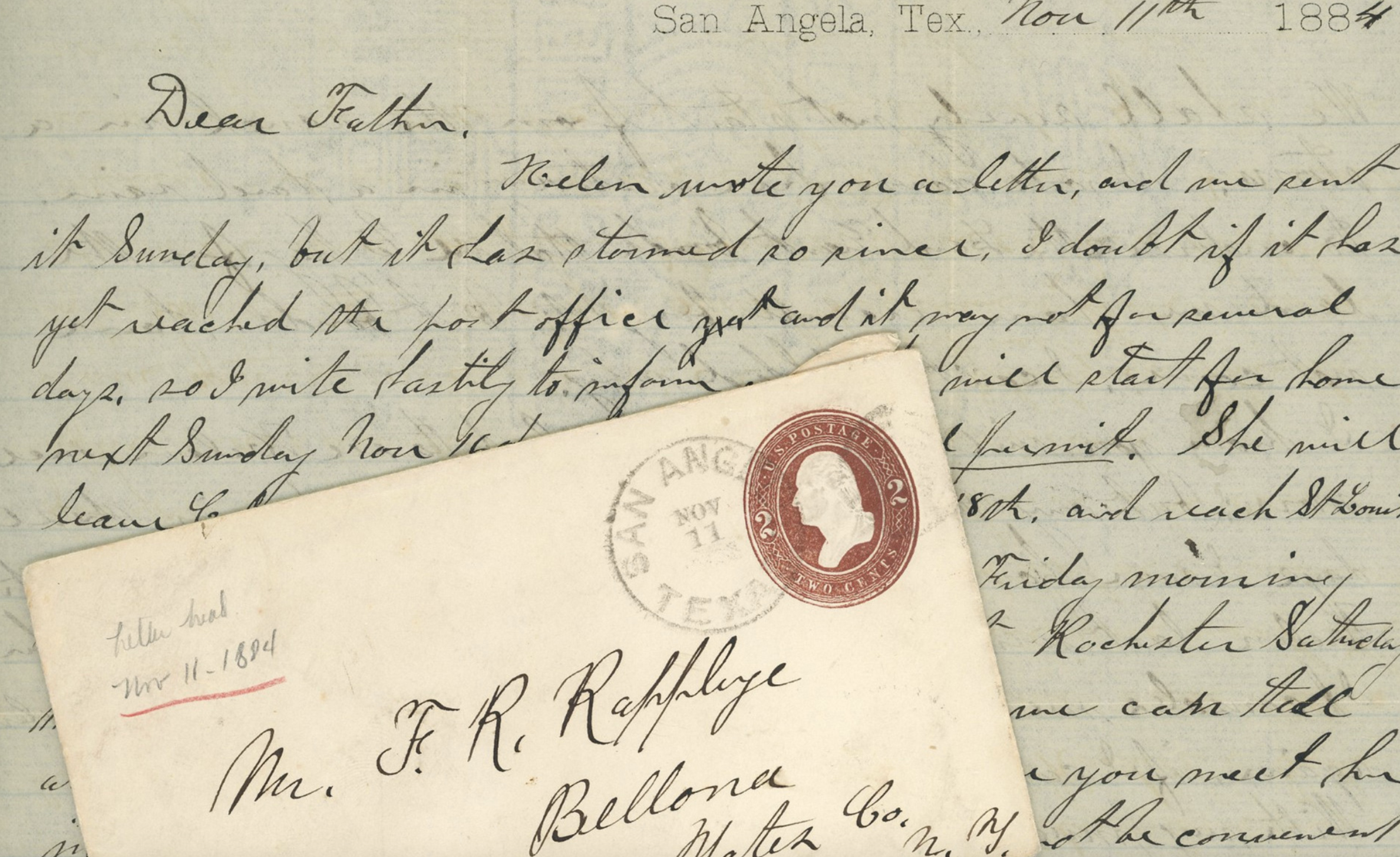 The exhibit invites patrons to travel to the past through the words of those who lived it. Featuring letters written by and to West Texans, the exhibit explores a wide variety of topics, including the frontier experience, wartime correspondence, business, and politics. It includes letters and papers from these collections within the West Texas Collection: