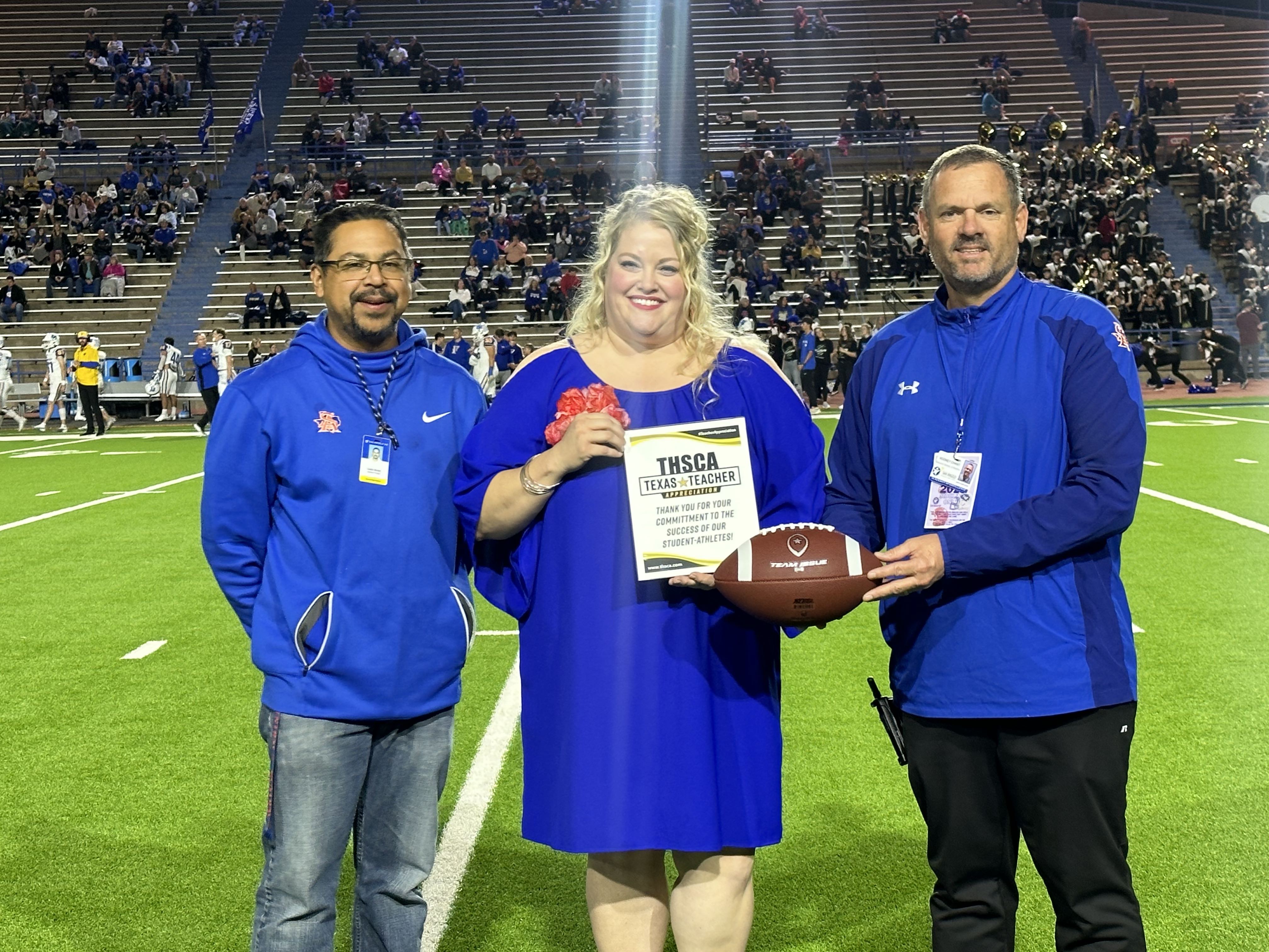 The Bobcat football coaching staff recognized Ms. Rodriguez for her commitment and dedication to student growth and opportunity, willingness to exemplify the characteristics of the education profile, and passion for preparing students to be future-ready. Midway through the 2nd quarter, Ms. Rodriguez posed for pictures with San Angelo ISD Athletic Director Rodney Chant on the 25-yard line as the stadium announcer honored Rodriguez.