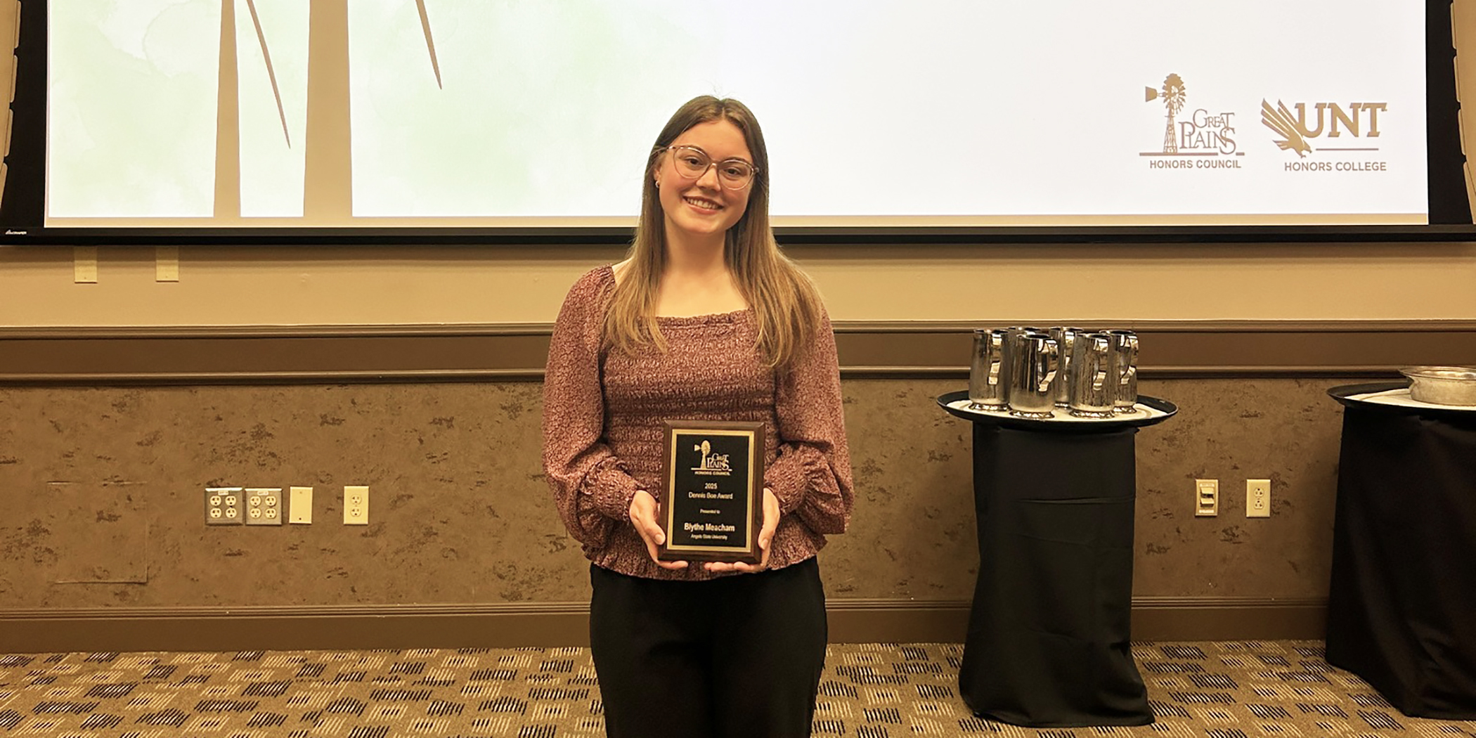 SAN ANGELO, TX - Blythe Meacham of Frisco, a junior in the Angelo State University Honors Program, won the top prize for her research presentation at the recent 2025 Great Plains Honors Council (GPHC) Conference in Denton.