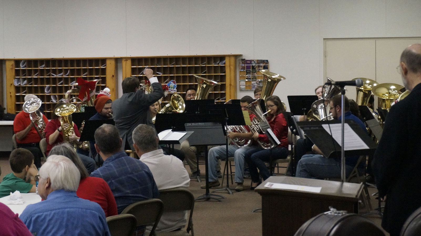 About 100 Christmas revelers gathered at the Trinity Lutheran Church, 3536 YMCA Drive, at noon Saturday to hear Christmas carols performed by 16 tubas and euphoniums, eight of each. The annual event, organized by volunteers and spearheaded by San Angelo tubist Eric Hansen, attracts musicians from all over the region. Two tubists drove down from Snyder, two from Sonora and one from Miles.