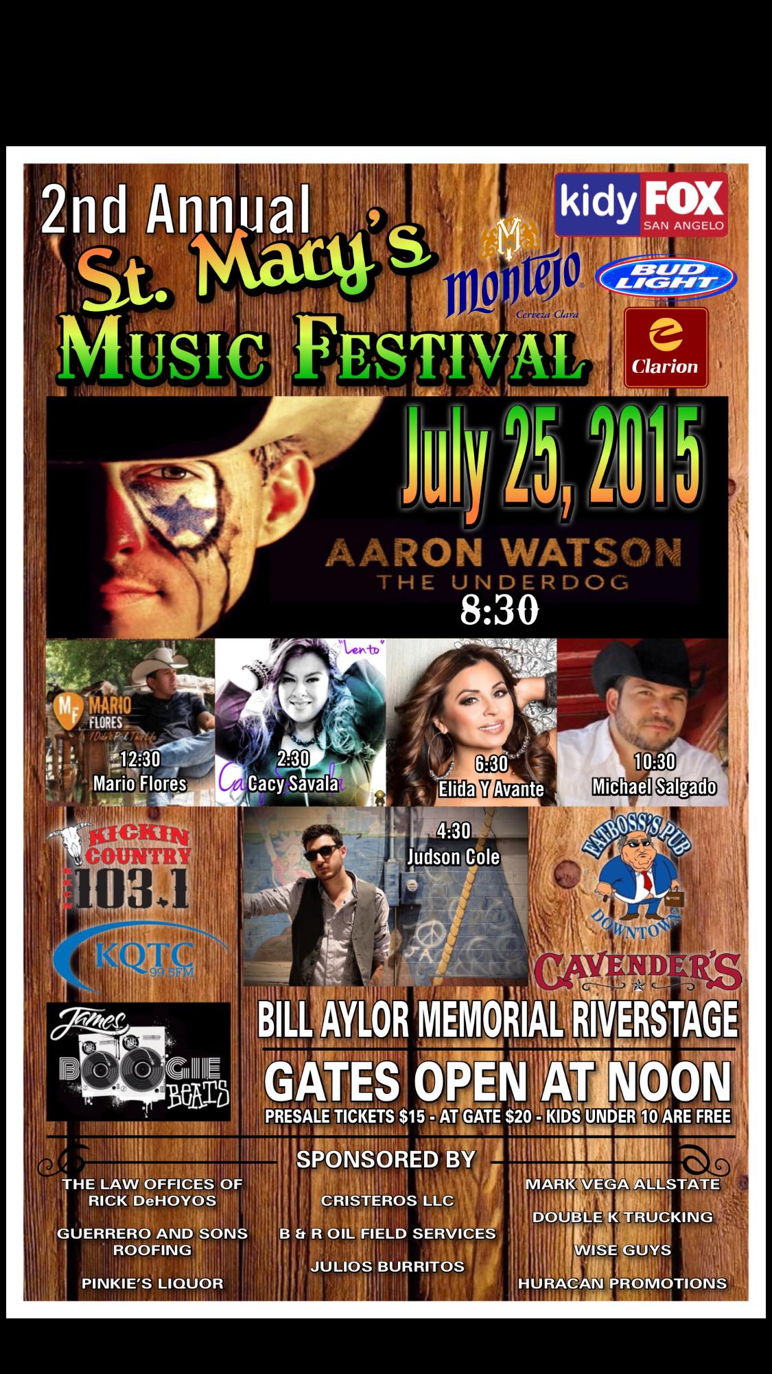 Aaron Watson, Elida Y Avante, Michael Salgado and Cacy Savala fans will join together to see their favorite stars on one stage beginning at 12:30 p.m. this Saturday, July 23, during the 2nd Annual St. Mary’s Music Festival at the Bill Aylor Sr. Memorial RiverStage.