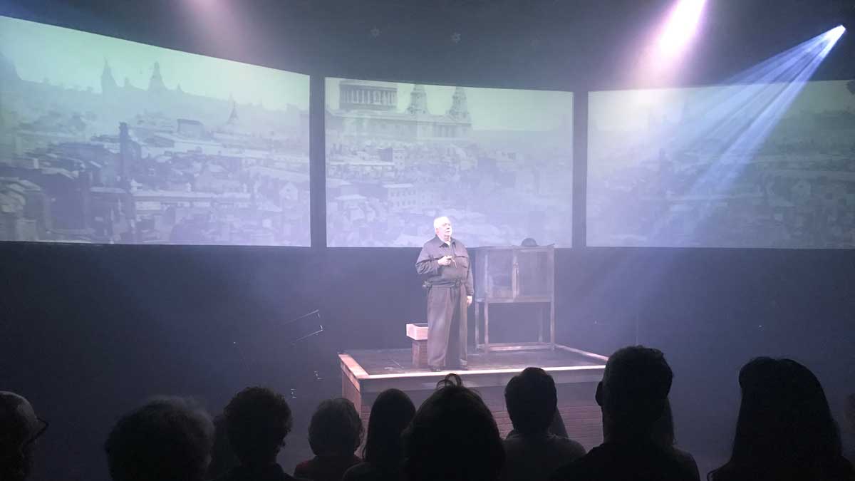 The second act is performed in the adjacent black box theater. There, with a three-screen multimedia display of rare footage and photos of London during the Battle of Britain, Churchill is seen perched on top of a roof as bombs drop on his beloved countrymen. He asks the crowd if they believe in miracles?