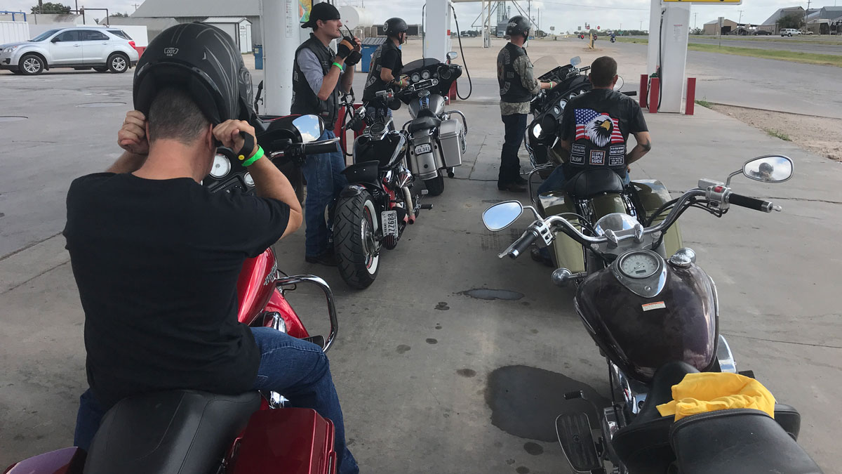 Gassed up with bean in pocket departing Water Valley, I met up with a motorcycle club made up of Goodfellow Air Force Base firefighters. These guys were instructors at the school there. The leader, call sign “Squirrel,” paced the five-ship down FM 2034 that winds east and north to Robert Lee where we were to fetch the next bean at the Allsup’s Convenience Store there. I moved into the #6 position in the back, enlarging Squirrel’s odd 5-ship into a full-fledged, even 6-ship formation.