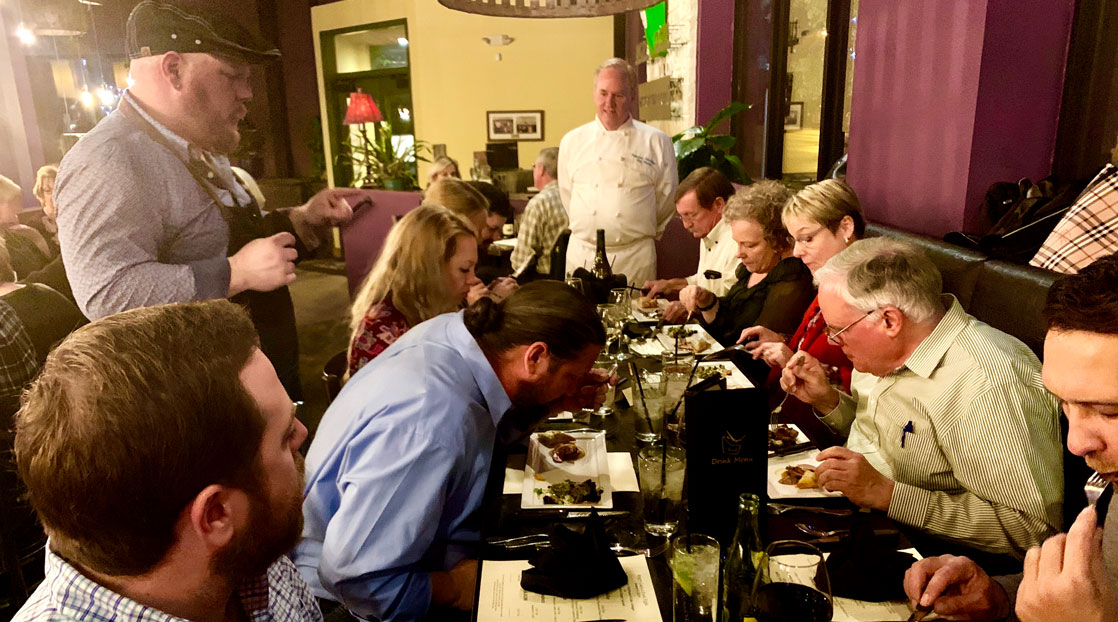 Chef Mulley made Seared Scalllop over Bacon Manchago Grits, Duck Two Ways, Rack of Lamb Cabernet Demi Mashed Yukon Gold Potatoes, and Raspberry Lemon Tart with Meringue. Mulley was the owner and executive chef at the River Terrace Restaurant in San Angelo from 2006 until 2012. There, his culinary abilities became legendary. But before that, he worked as the game day chef for the owner’s suite for the Dallas Cowboys at Texas Stadium in Dallas.