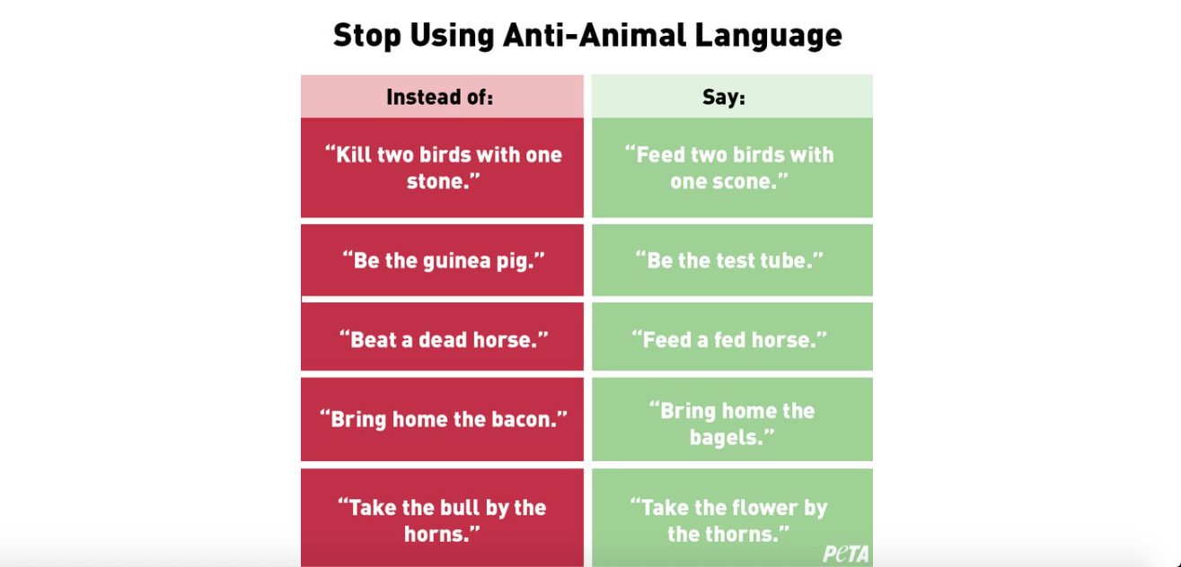 The animal rights organization has a list of suggestions for alternate phrases that don't put animals in a bad light.