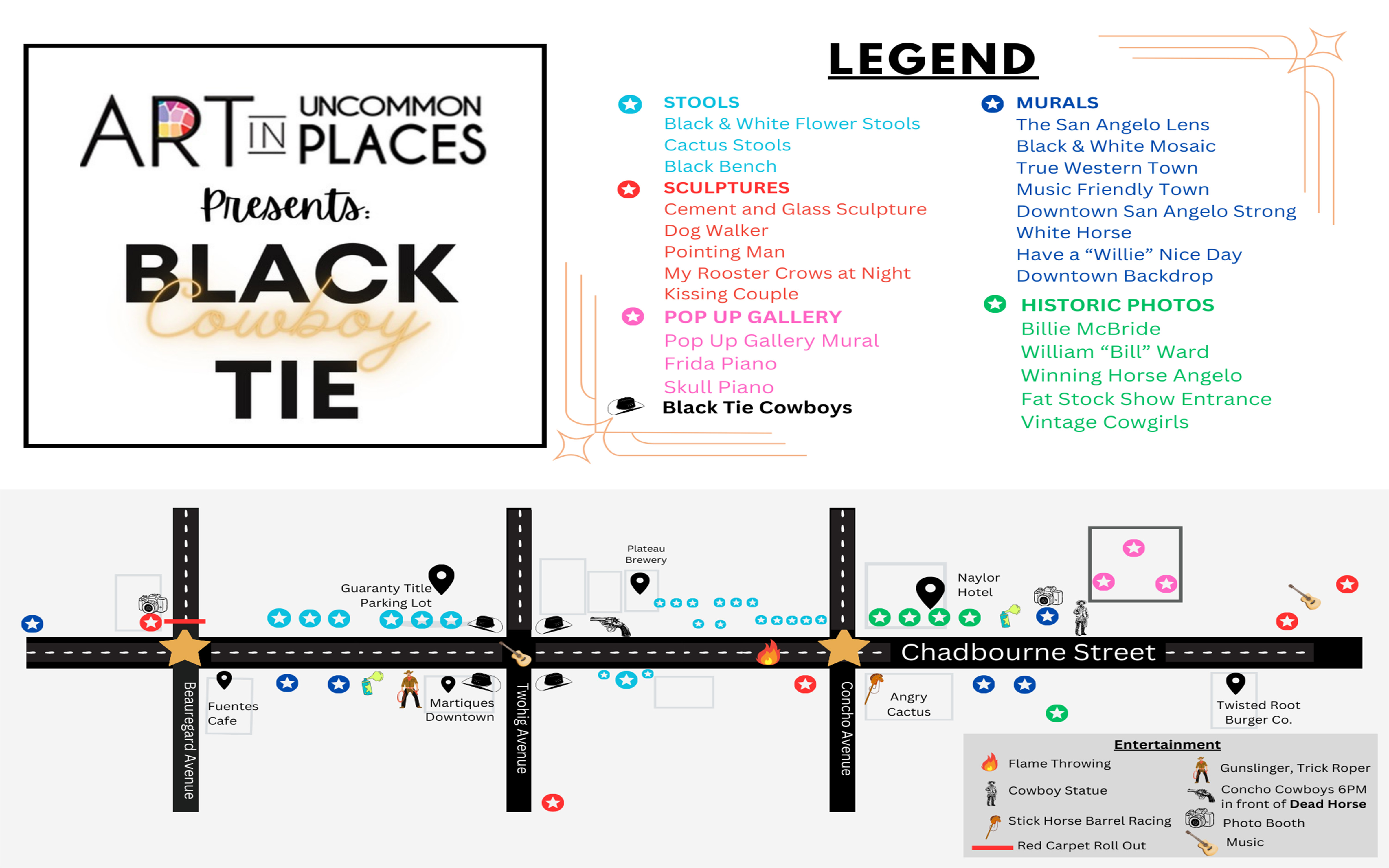 "Black Tie Cowboy promises to be a celebration of San Angelo's vibrant arts scene and community spirit," information stated. "Don't miss out on this opportunity to experience the magic of downtown San Angelo and celebrate Art in Uncommon Places."