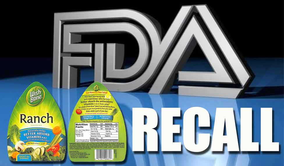 A nationwide recall is in effect as of June 23, 2015 regarding Wishbone Ranch Salad Dressing variety. Pinnacle Foods Group LLC has voluntarily recalled a total of 8,678 cases of the 24 oz. ranch dressing bottles which were shipped all over the United States. The recall is a result of a mix-up during packaging. Wishbone Blue Cheese Dressing was inadvertently packed in the Wishbone Ranch Salad Dressing bottles. Blue cheese dressing contains eggs, an allergen not declared on the package.