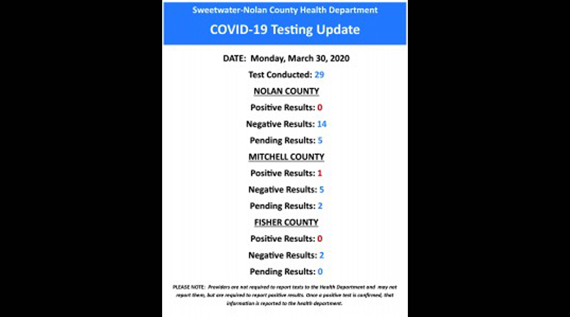 As of Monday, March 30, Nolan, Mitchell, and Fisher counties, have tested 29 individuals. They have obtained 21 negative results, 1 positive and 7 are pending.
