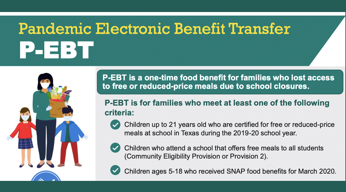 P-EBT works the same way the Supplemental Nutrition Assistance Program (SNAP) benefits do and will help families get the food they need during the current pandemic.