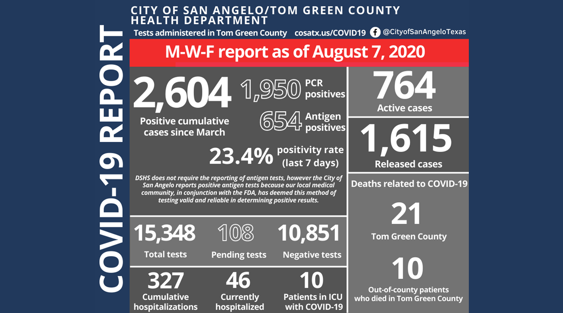 According to the City of San Angelo, on August 7, since the beginning there have been 2,604 total confirmed cases of COVID-19 in Tom Green County. Tom Green County has a population of 119,200.