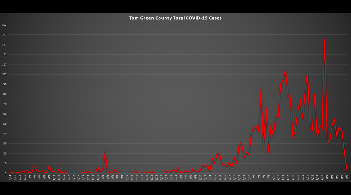 So have COVID-19 infections peaked in Tom Green County? If the current trend for the first week of August is the indication, then the answer is likely yes. You decide.