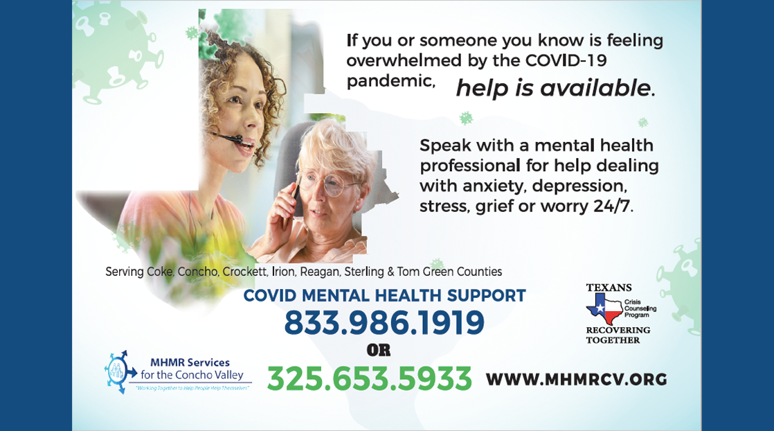 Telephone crisis outreach workers are currently available to people of the Concho Valley (Coke, Concho, Crockett, Irion, Reagan, Sterling, and Tom Green Counties) who are feeling overwhelmed by the effects of the COVID pandemic.