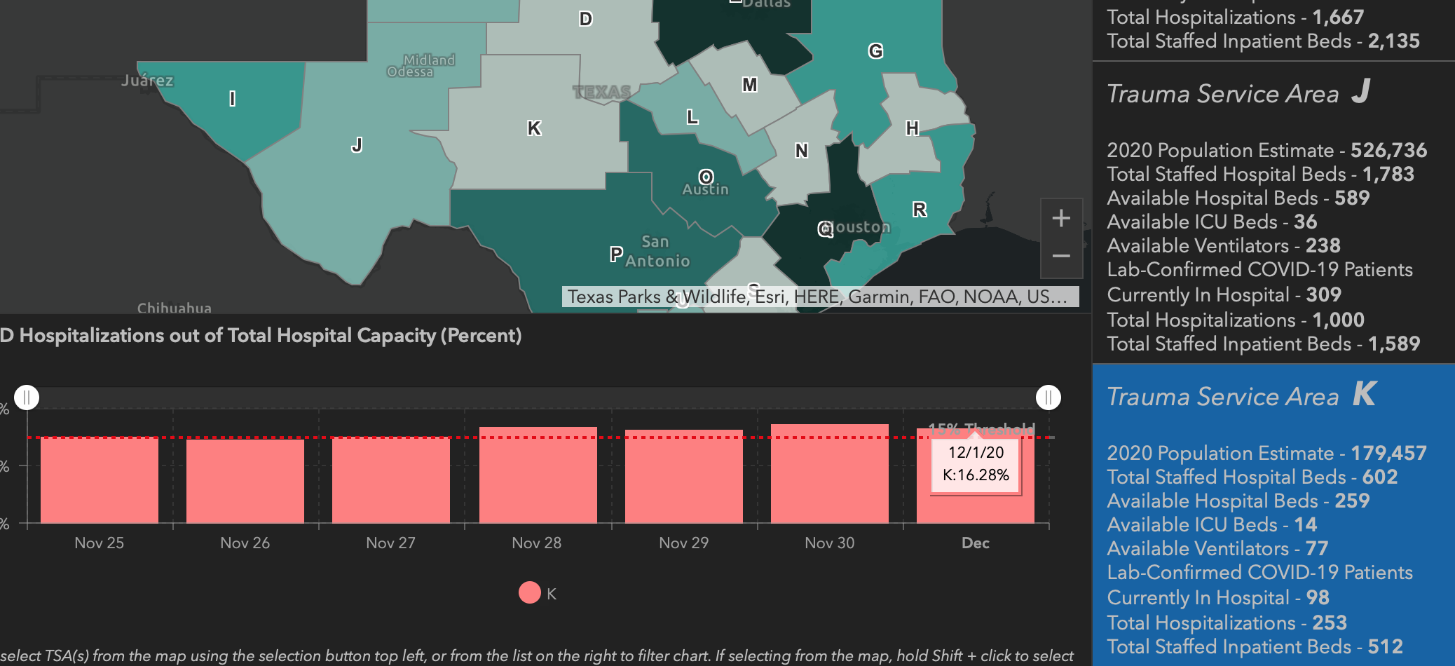 As of Wednesday, Dec. 2, TSA K has experienced four consecutive days where COVID-19 hospitalizations have exceeded 15 percent. If the trend continues, the seventh day is Saturday. However, if any day between now and Saturday is below 15 percent, the 7-day clock is reset. After the 7-day rule is tripped GA-32 states that the TSA K will need to report 7 days where hospitalizations are less than 15 percent before bars can open back up and restaurants can increase patronage to 75 percent capacity.