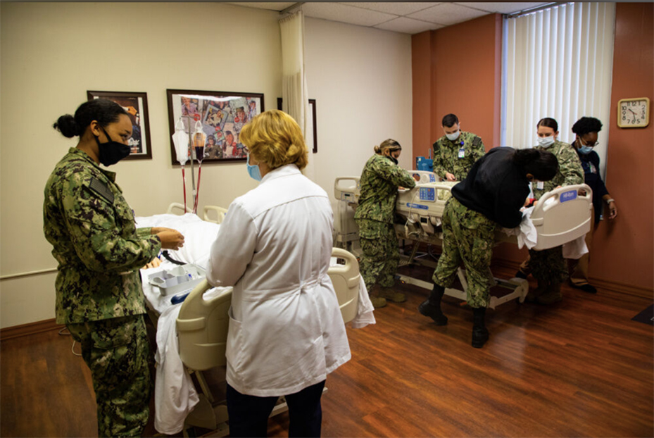 The group of military personnel is a mix of ICU and medical surge RNs and respiratory techs from the Army, Navy, and Air Force.