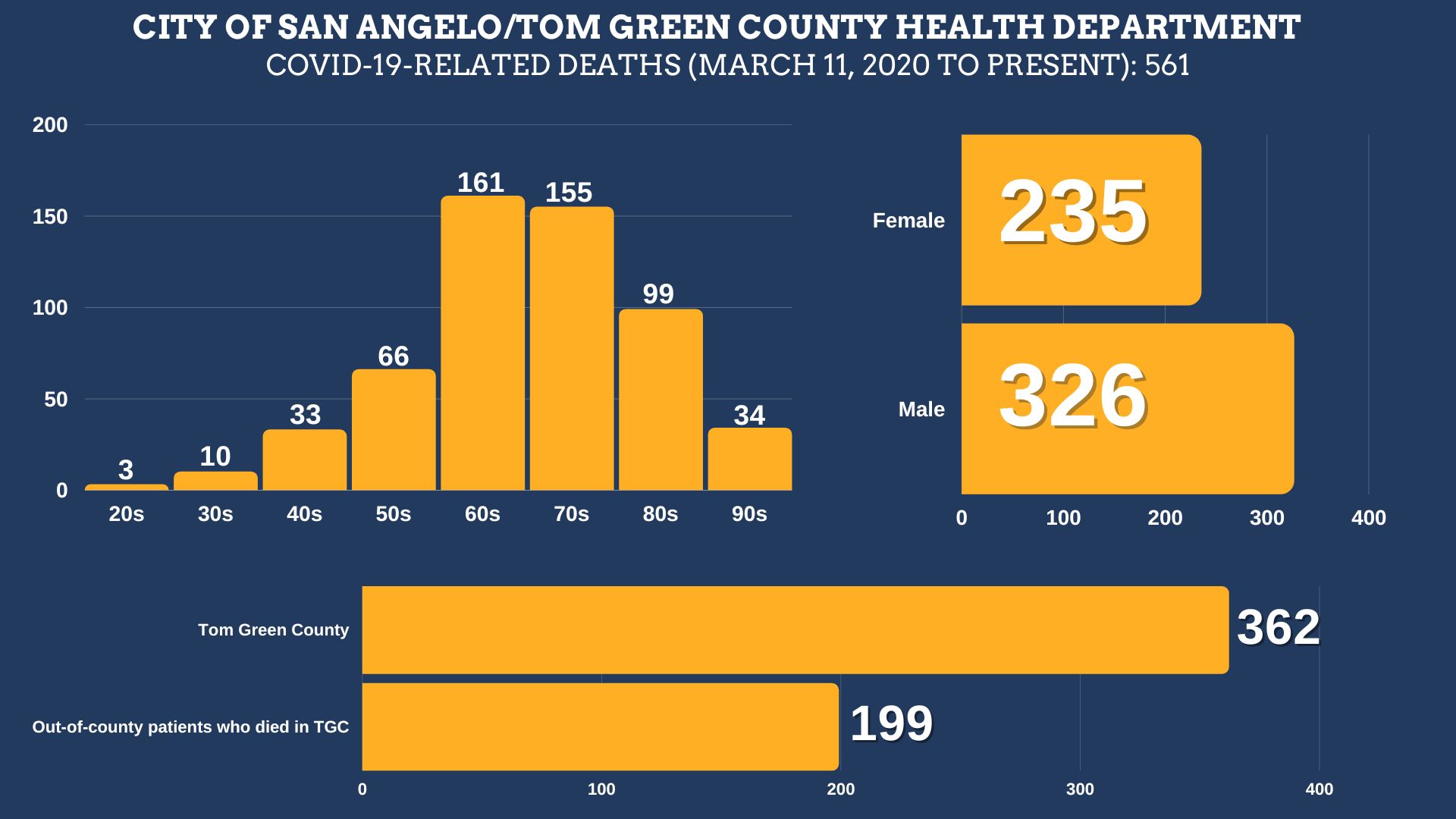 Total deaths in Tom Green County: 561 (362 from Tom Green County and 199 from other counties)