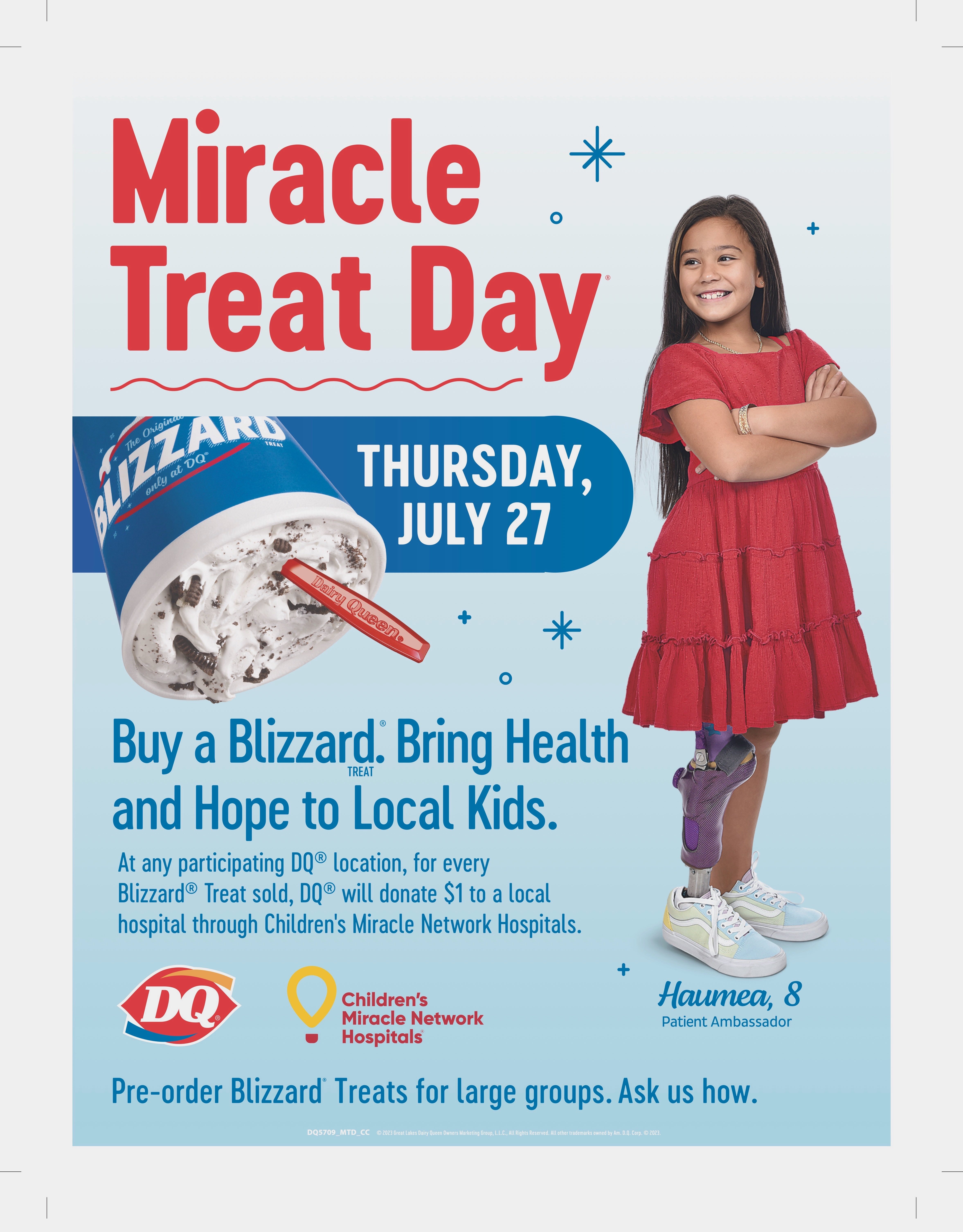 Mark your calendars for Thursday, July 27, to support Children’s Miracle Network Hospitals. Visit a DQ dining room or use the convenient drive-thru.