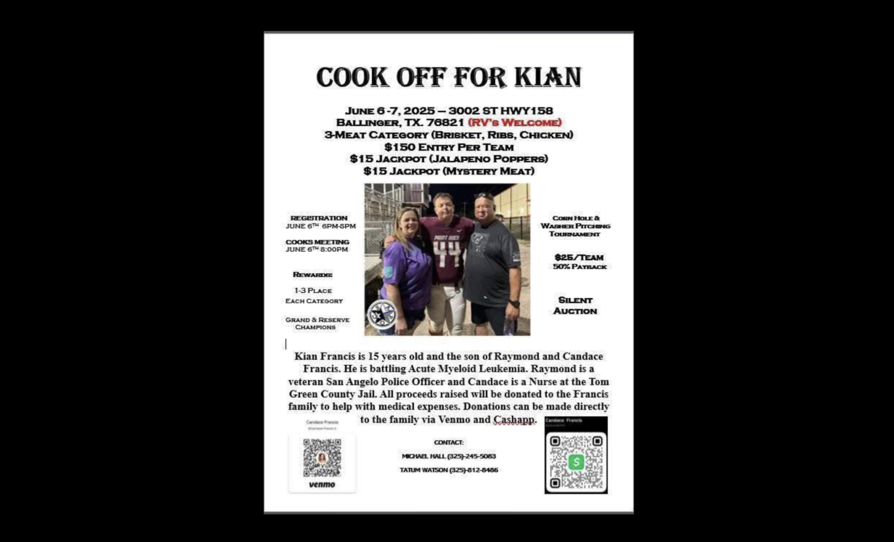 The “Cook Off for Kian” is a barbecue cook-off to help raise money for the Francis family. The cook-off is on June 6-7 at 3002 State Highway 158 in Ballinger.