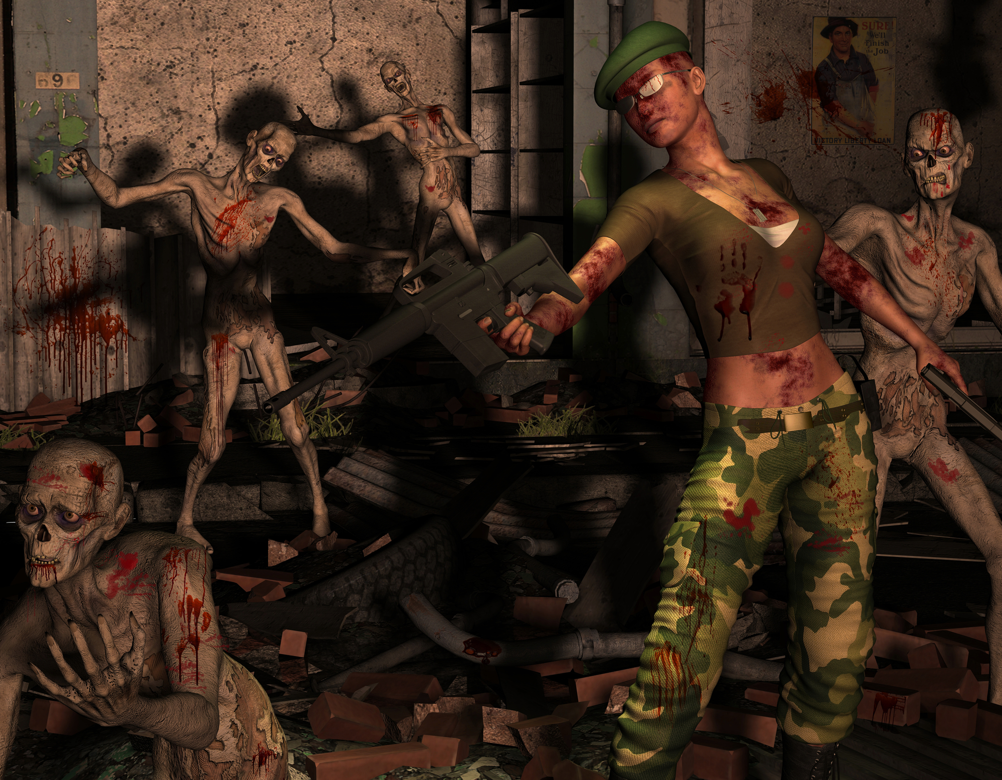 Nick throws himself back against the wall and takes a deep breath. He picks up a church handle iron and proceeds slowly. When he turns the corner, he sees “Gloria” in her panties kneeled over something, almost as if in prayer. He says, “Love, we gotta go.” Unfortunately, Gloria is not on her knees praying; instead, she looks up with blood and meat around her mouth, and her eyes, with their light blue, sightless orbs, stands up in her naked glory and starts after Nick, who notices a dead unknown African American male on the floor, the body Gloria had fed from. Unable to comprehend what’s happening, Nick falls back, runs out of the church, and right into a car.