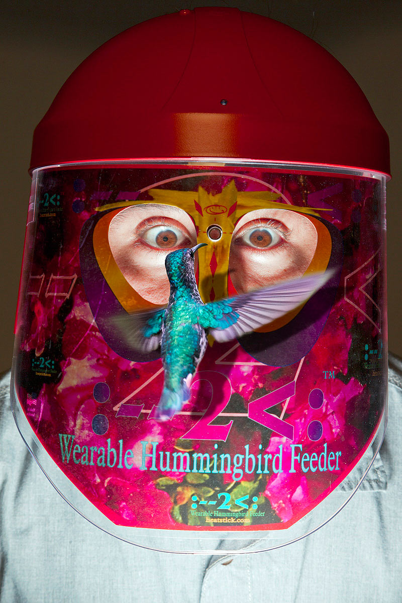 As wonderful as these gift ideas are, they pale in comparison to the most impressive (by which I mean stupid) gift on our list, which is the Wearable Hummingbird Feeder, available from heatstick.com. This is a helmet that looks like one of those huge old diving helmets, except that it’s made of festively colored plastic. It sits on your shoulders, and has a reservoir in the top, which you fill with sugar water. The spigot for hummingbirds to drink is right between the eyes of the wearer, so when birds come to drink, they will be really, really, really close.