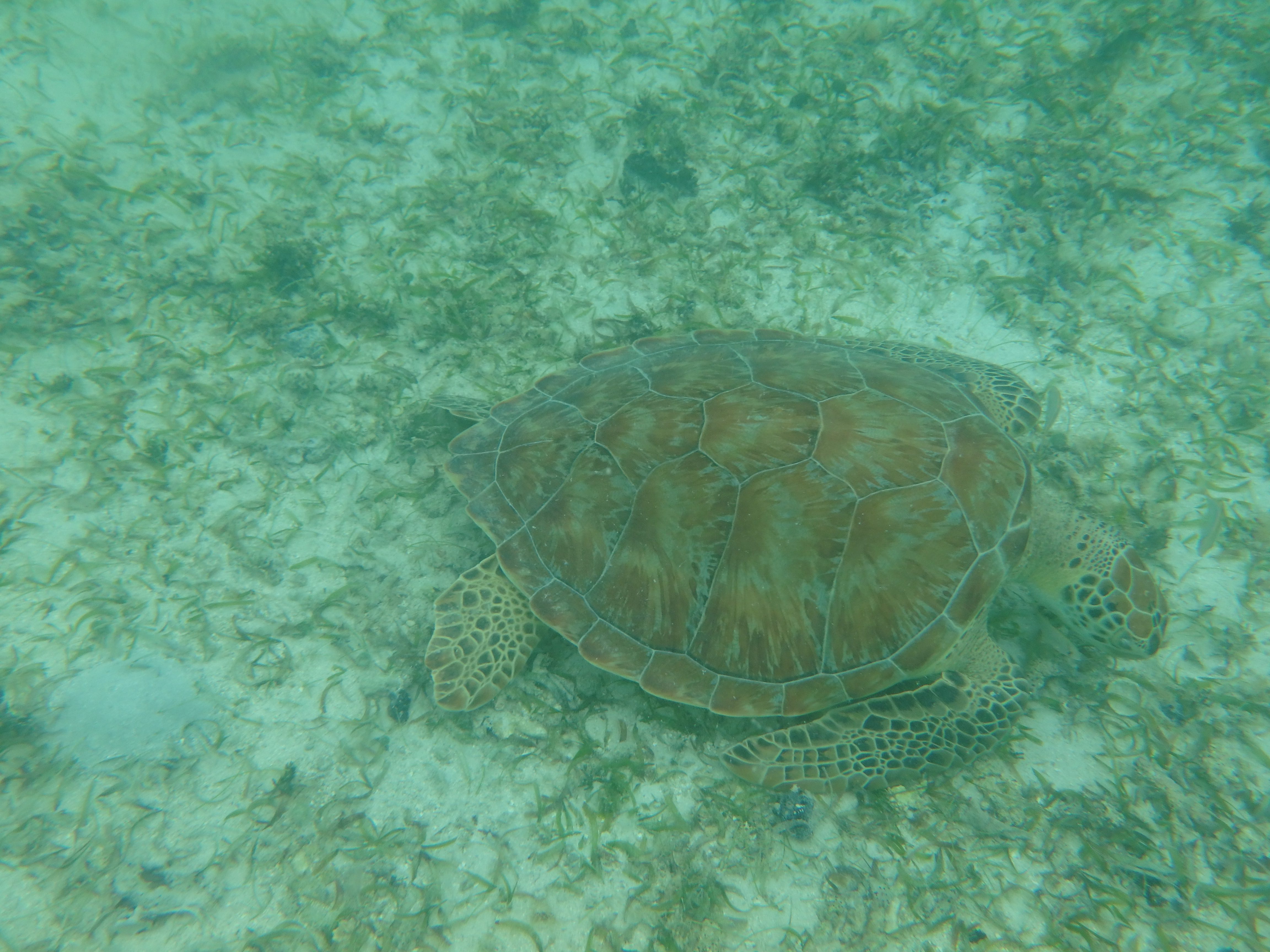 And finally, on our last day, in a beautiful little cove called Maho Bay, we found sea turtles. They ranged from two to three feet long, and they pretty much ignored us. They were grazing on sea grass on the bottom of the bay in about eight feet of water, and once in a while they would swim to the surface for a breath of air, ignore us some more, and go back to eating grass.