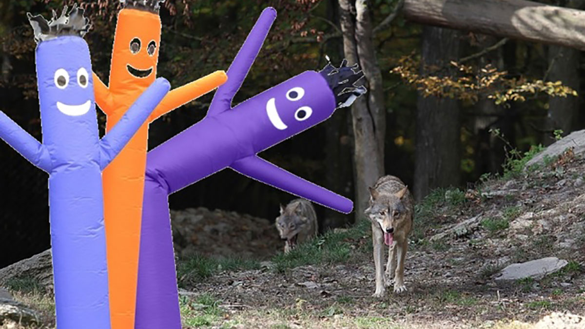 And walruses aren’t the only ones doing stupid things lately. There’s an animal rights group called Defenders of Wildlife, which claims to defend wildlife. And when they heard about a pack of gray wolf pack that was killing cattle around Butte Falls, Oregon, DofW decided to help out. Not personally, of course. What they did was talk a rancher named Ted Birdseye into using inflatable dancing men to scare off the wolves. Really.