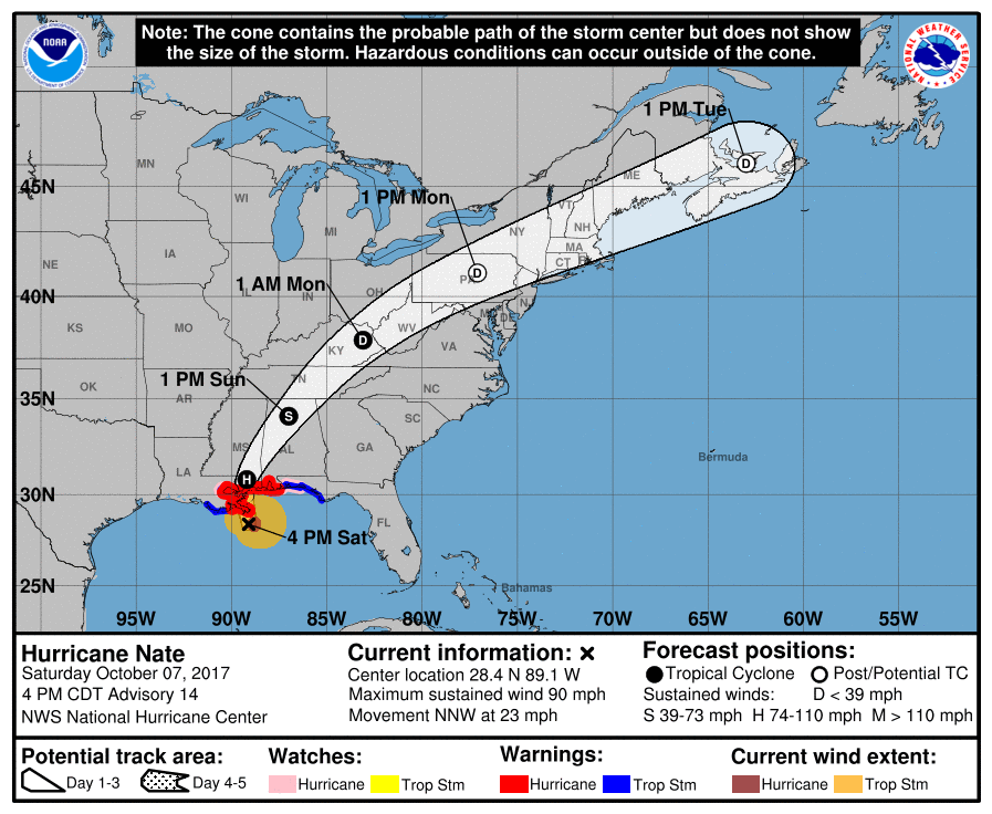 NEW ORLEANS, LA -- AT 4 p.m. Saturday, Hurricane Nate is moving toward the north- northwest near 23 mph as a strong Category 1 hurricane with 90 mph winds, and is expected to pass over portions of Lower Plaquemine Parish in the next few hours.