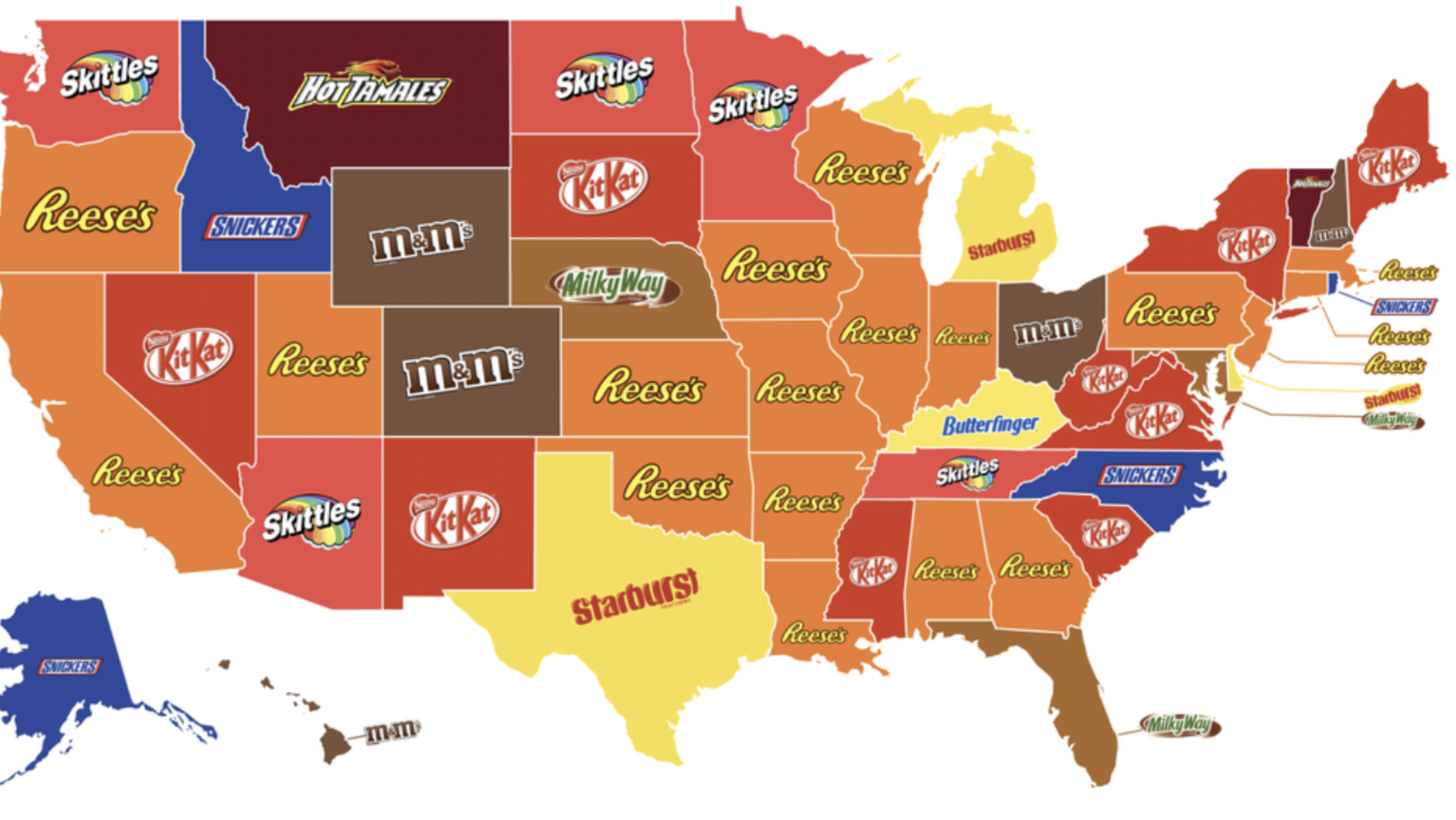 The most popular candy in Texas according to the survey is Starburst, and the most popular candy in the United State is Reese’s Cups. Following that is Kit-Kats, M&M’s, Skittles, Snickers, Milky Way, Hot Tamales, then Butterfingers!