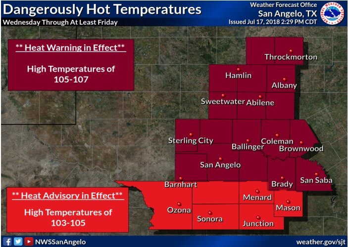 SAN ANGELO, TX -- The National Weather Service in San Angelo has issued an Excessive Heat Warning in effect from noon Wednesday to 7 p.m. Friday.