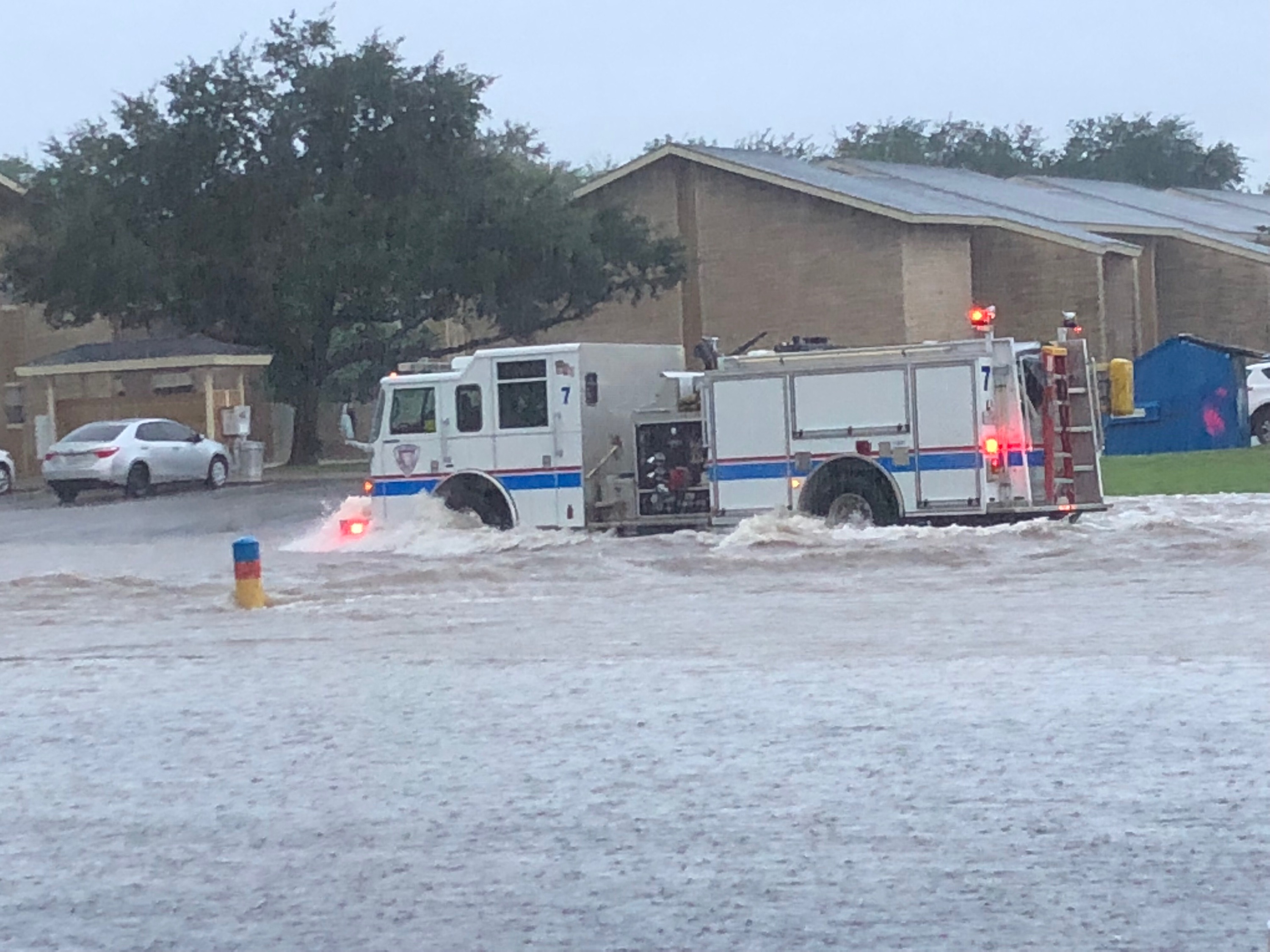 The photos used in this story are telling. The fire truck is seen in water up midway on the wheels, while a car is parked high and dry on the edge of the street. The stop action pic on the video shows a truck completely out of water, and a car turning a corner about to go under! Flooding is serious, and hopefully those streets will be able to handle that water as they should, and keep it away from homes, etc. It is just that folks need to stay off those streets!