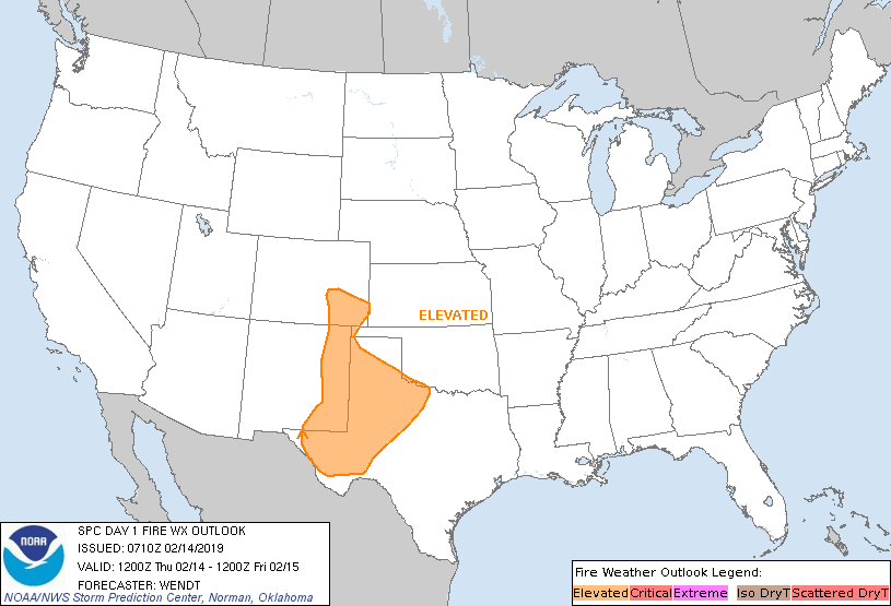 According to the National Weather Service office in San Angelo, elevated to near critical fire weather conditions will affect areas mainly west of a Throckmorton to Abilene to San Angelo line this afternoon due to gusty west winds, relative humidity values between 15 and 25 percent, and very warm temperatures.