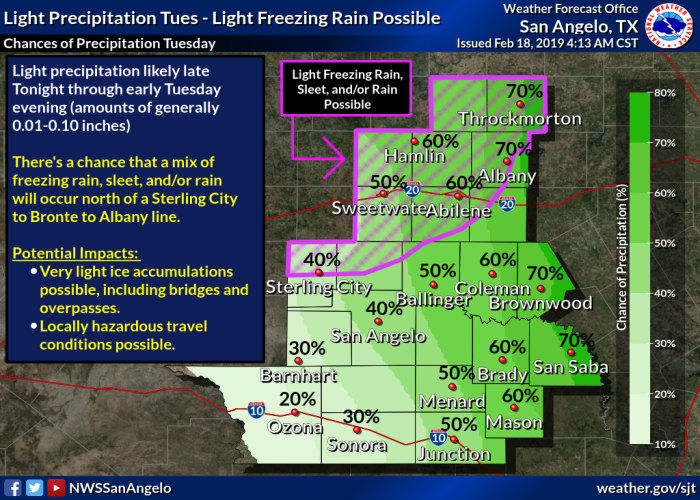 Light precipitation will develop across West Central Texas on Tuesday morning. This precipitation may fall as freezing rain/drizzle or sleet across the Big Country and northern Concho Valley with surface temperatures at or below freezing.