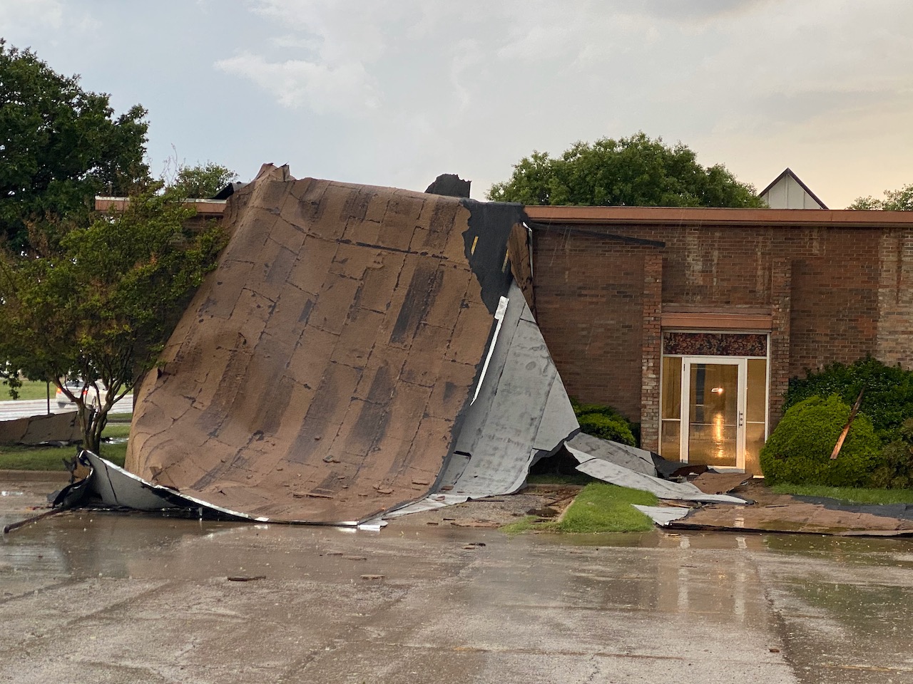 Near Angelo State University, a roof on a part of St Mark Presbyterian Church blew off. Over the radio, there was a report of an overturned delivery truck with the driver trapped inside. We could not pinpoint the location. First responders were worried about the downed power line draped over the truck.