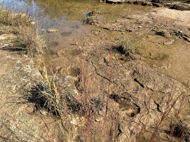 Recent rains have covered some of the Permian era tracks under shallow water which makes them a little easier to see in the morning fall sunlight.