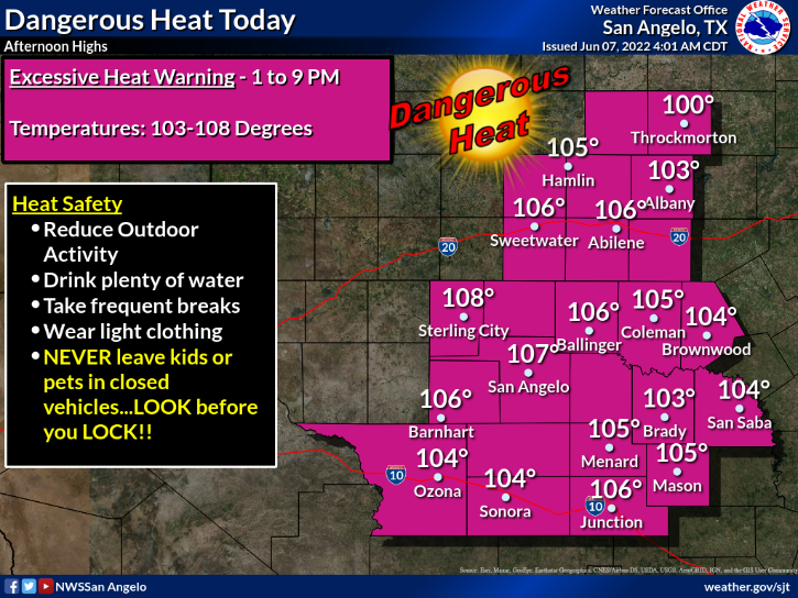 The NWS has issued an Excessive Heat Warning for all of West Central Texas as the Lone Star State sees temps above 100 degrees almost statewide.