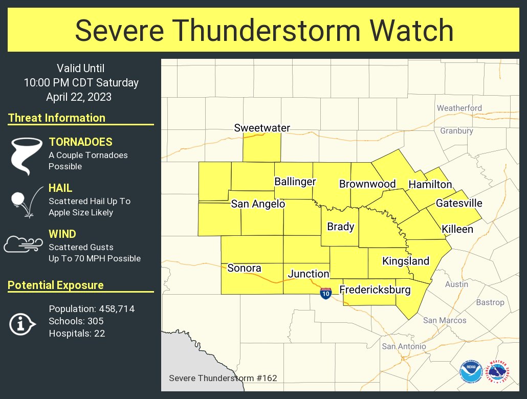The NWS issued a Severe Thunderstorm Watch for the eastern counties of the Concho Valley including Tom Green County and the City of San Angelo for Saturday from 2:40 p.m. to 10 p.m.