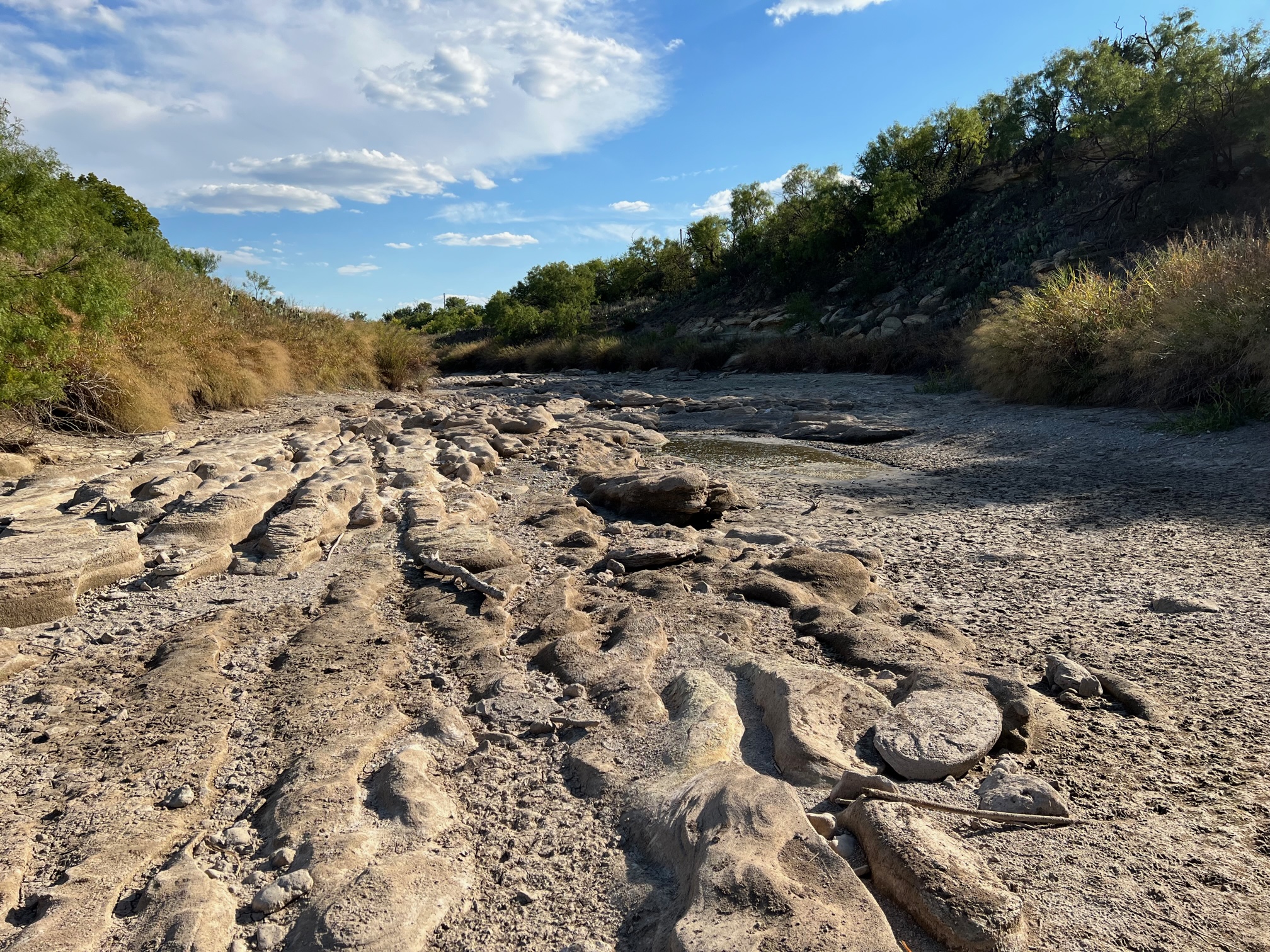 SAN ANGELO – The N. Concho River in the San Angelo State Park has been essentially dry for several months following withering dry drought and heat for the last two years. Two recent rain events and a solar construction project contributed to filling up some of the dry holes along the river in recent days.