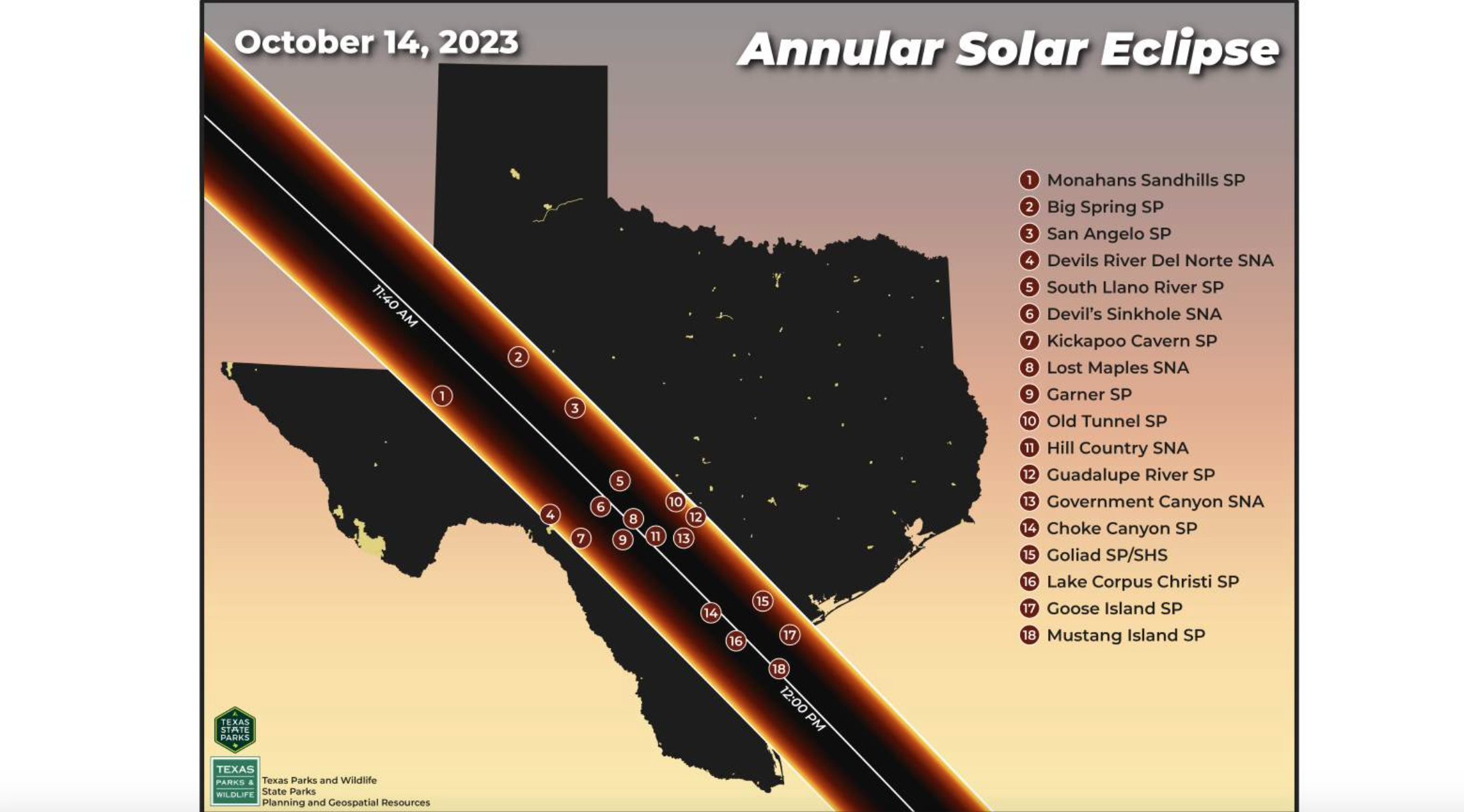 AUSTIN – Less than a month remains until a much-anticipated annular solar eclipse graces Texas skies. On Saturday, October 14, an annular eclipse will pass over the state from Midland/Odessa to Corpus Christi, with 17 Texas State Parks along its path of greatest eclipse visibility. Visitors planning to visit state parks along the path are highly encouraged to reserve a day pass in advance since they will likely reach capacity.