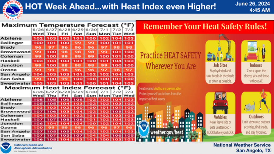 Residents across the region should prepare for intense heat, with heat index values reaching up to 108°F in areas like Albany, Coleman, and Ballinger. San Angelo itself is projected to experience heat indices between 105°F and 107°F over the next several days.