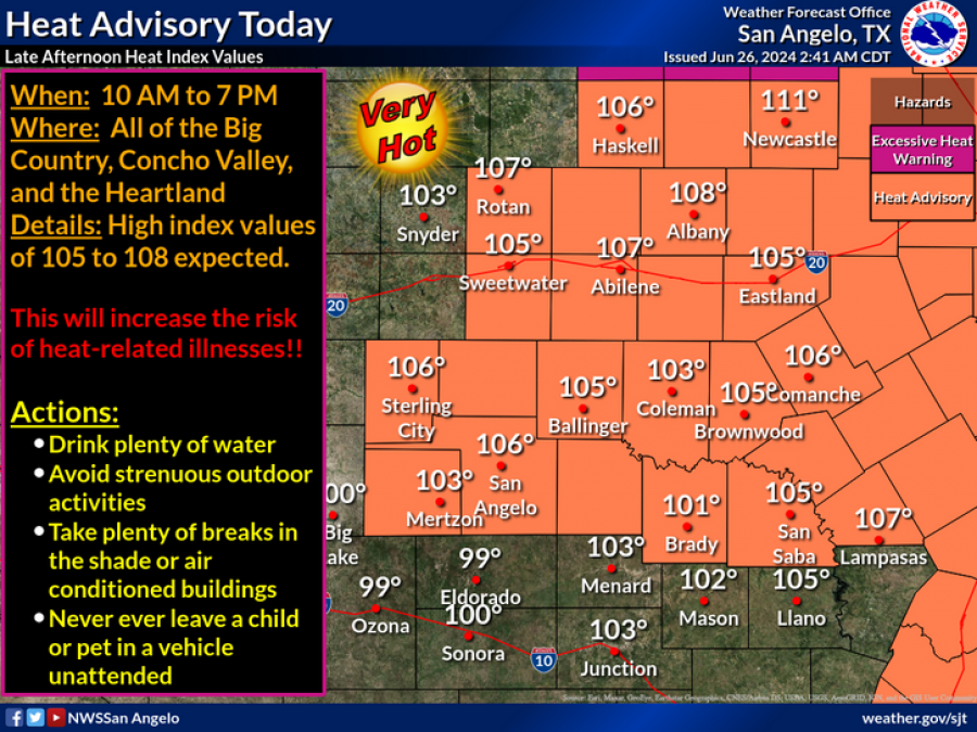 SAN ANGELO, TX – The National Weather Service (NWS) has issued a heat advisory for San Angelo and the surrounding regions, including the Big Country, Concho Valley, and the Heartland.