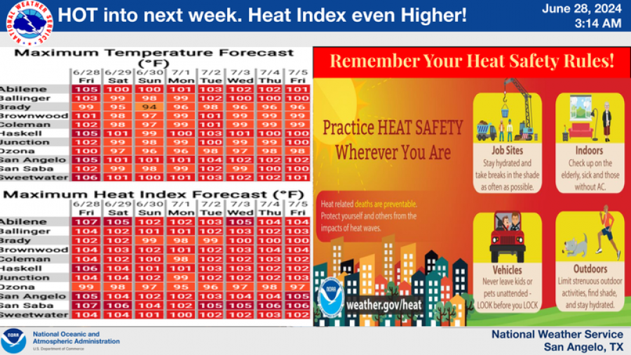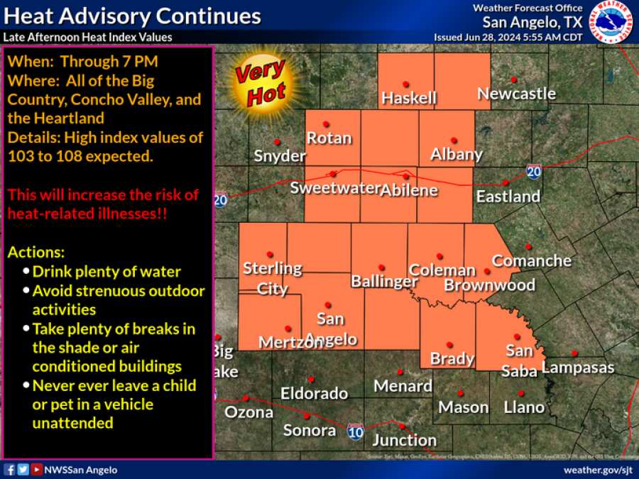 SAN ANGELO, TX — The National Weather Service has issued a heat advisory for San Angelo and surrounding areas, including the Big Country, Concho Valley, and the Heartland.