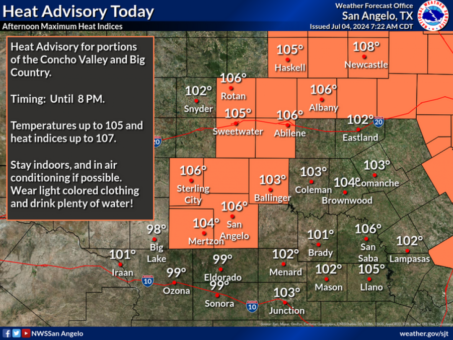 SAN ANGELO, TX – The National Weather Service has issued a heat advisory for portions of the Concho Valley and Big Country, including San Angelo, effective until 8 p.m. today.