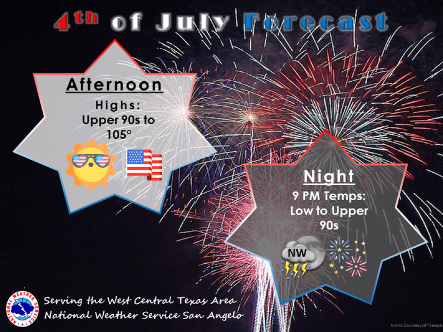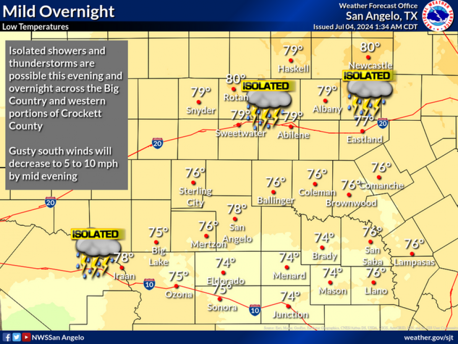 Evening temperatures around 9 p.m. will remain high, ranging from the low to upper 90s. Despite the heat, isolated thunderstorms are possible, particularly across the Big Country and western portions of Crockett County.