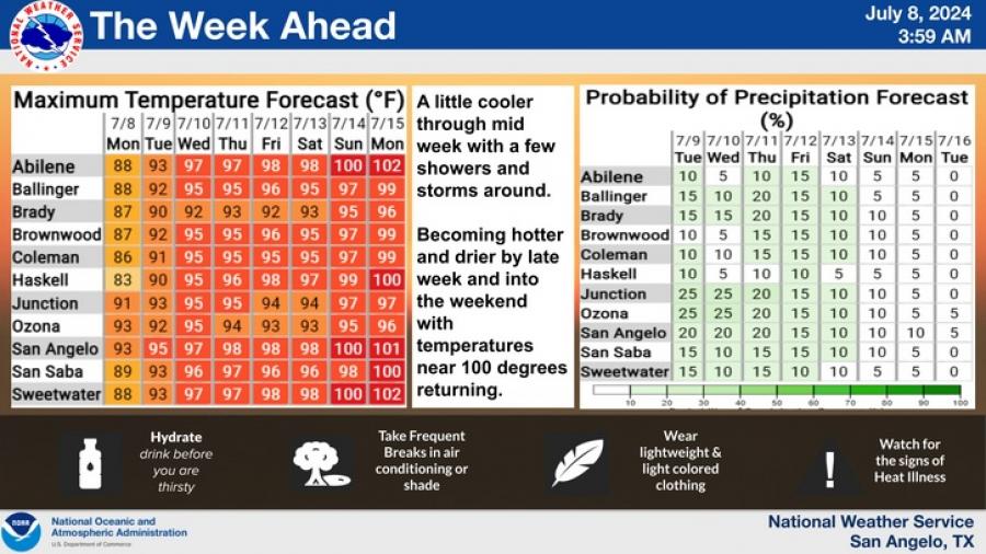 SAN ANGELO, TX – The National Weather Service has released the forecast for the upcoming week, predicting a mix of sunny skies and slight chances of showers, with temperatures gradually climbing towards the weekend.