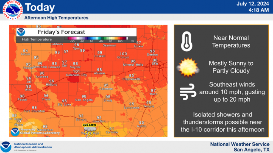 Saturday and Sunday will remain partly cloudy with a slight chance of isolated storms, mainly affecting the Big Country. Morning lows will range from the lower to mid-70s, while afternoon highs will vary from the mid-80s to near 100 degrees.