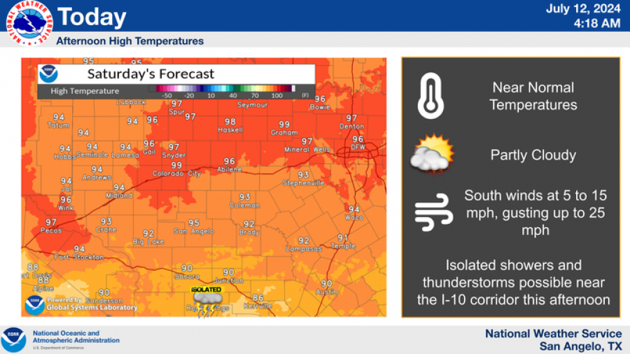 The NWS highlights that chances for rain on Saturday will be highest across the southern counties in the Northwest Hill Country and Northern Edwards Plateau, decreasing further north. Temperatures will remain near normal, with highs in the 90s and lows in the low to mid-70s.