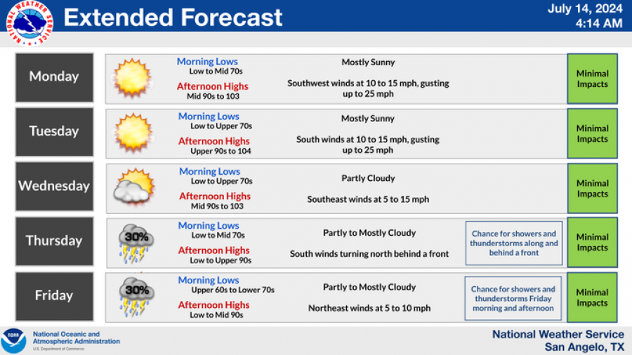 SAN ANGELO, TX — The National Weather Service has released a detailed weather forecast for San Angelo, predicting scorching temperatures and minimal chances of rain for the upcoming week.