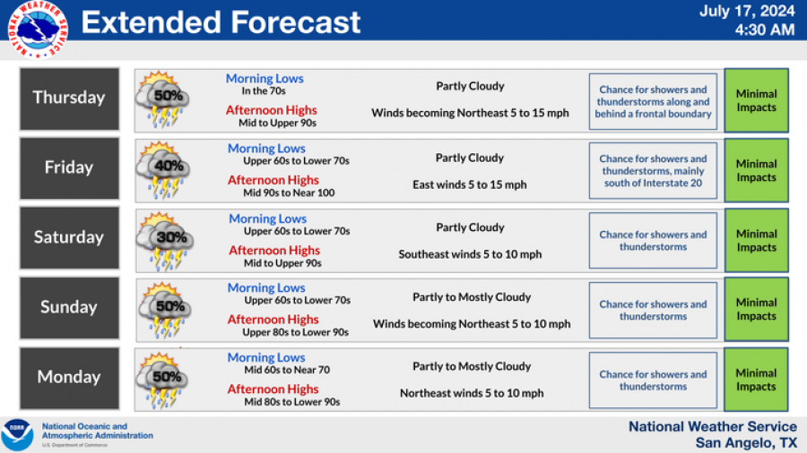 The extended forecast shows a continued chance of showers and thunderstorms through the weekend and into Monday. Morning lows will be in the upper 60s to lower 70s, with afternoon highs ranging from the mid-80s to upper 90s.
