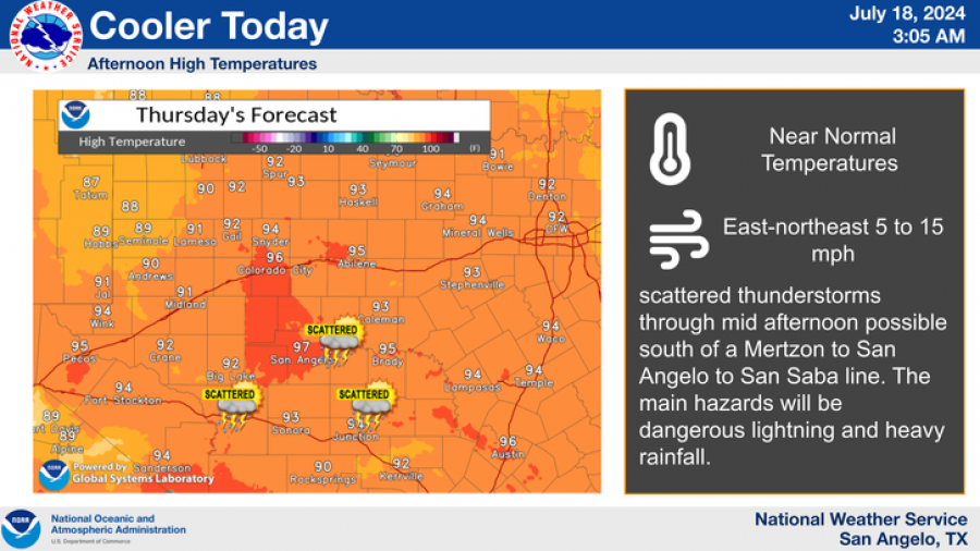 The forecast for today indicates temperatures will remain near normal, with highs ranging from the upper 80s to mid-90s. The east-northeast winds will be between 5 to 15 mph. Scattered thunderstorms are expected in the afternoon, particularly south of a line from Mertzon to San Saba. The main hazards will include dangerous lightning and heavy rainfall.