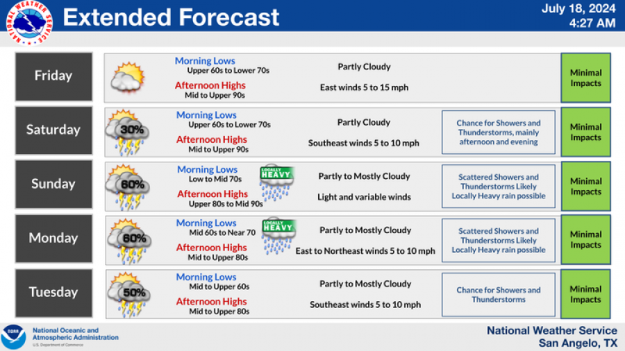 - Friday: Partly cloudy with morning lows in the upper 60s to lower 70s and afternoon highs in the mid to upper 90s. East winds of 5 to 15 mph are expected.
