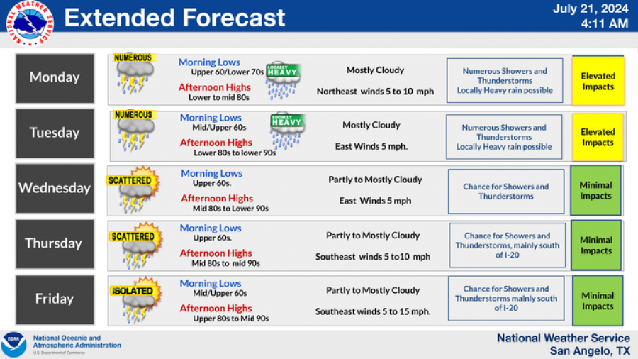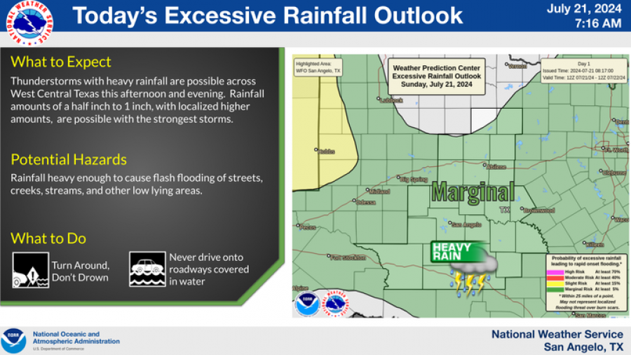 SAN ANGELO, TX - The National Weather Service in San Angelo has released an excessive rainfall outlook for West Central Texas, forecasting heavy thunderstorms and potential flash flooding starting this afternoon and continuing into the evening.